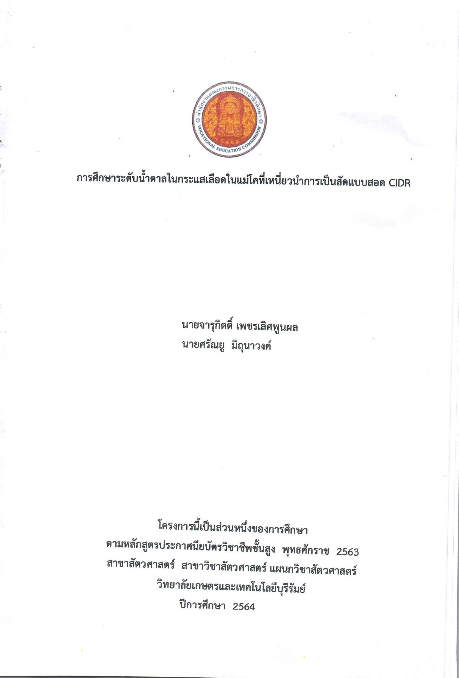 การศึกษาระดับน้ำตาลในกระแสเลือดในแม่โคที่เหนี่ยวนำการเป็นสัดแบบสอดcidr